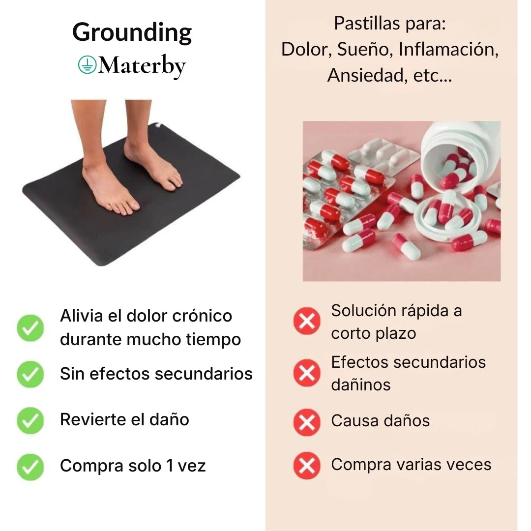 Nuestra Esterilla para Terapia de Grounding Materby™ se conecta al puerto de tierra del enchufe, una vía 100% segura, sin corriente activa, diseñada simplemente para dirigir la energía hacia la tierra.